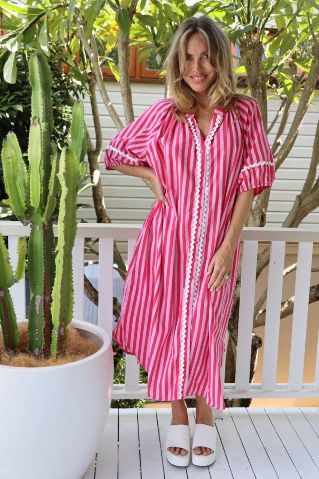 This bright, vibrant midi dress has all you need to get the Summer vibes! It's a loose but flattering fit with pockets for all your goodies, plus relaxed sleeves and cute ric rac trim. Make this summer your own with this one-of-a-kind dress!