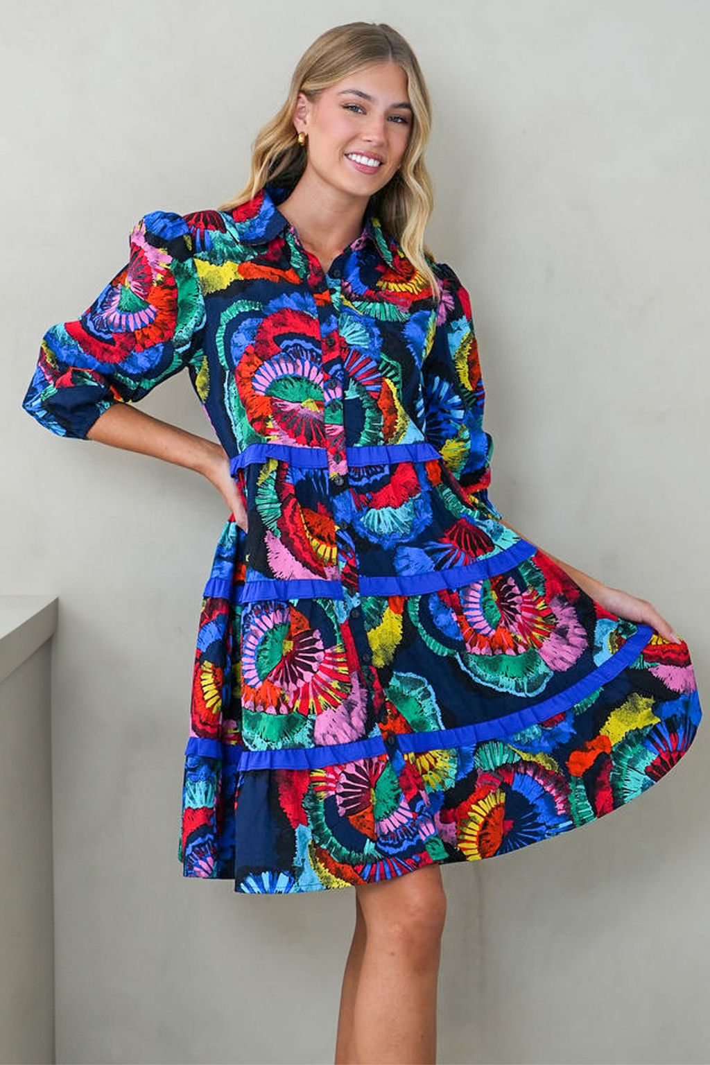 Step into a technicolour dream with the Lovers Dress. Bursting with a bold abstract print in vibrant jewel tones, this statement piece is made to turn heads. Featuring a button-down front, playful tiered skirt, and 3/4 length sleeves. The structured cotton blend gives it a crisp silhouette while keeping things breathable. Pair with chunky slides for weekend adventures or elevate with heels for a standout event look.