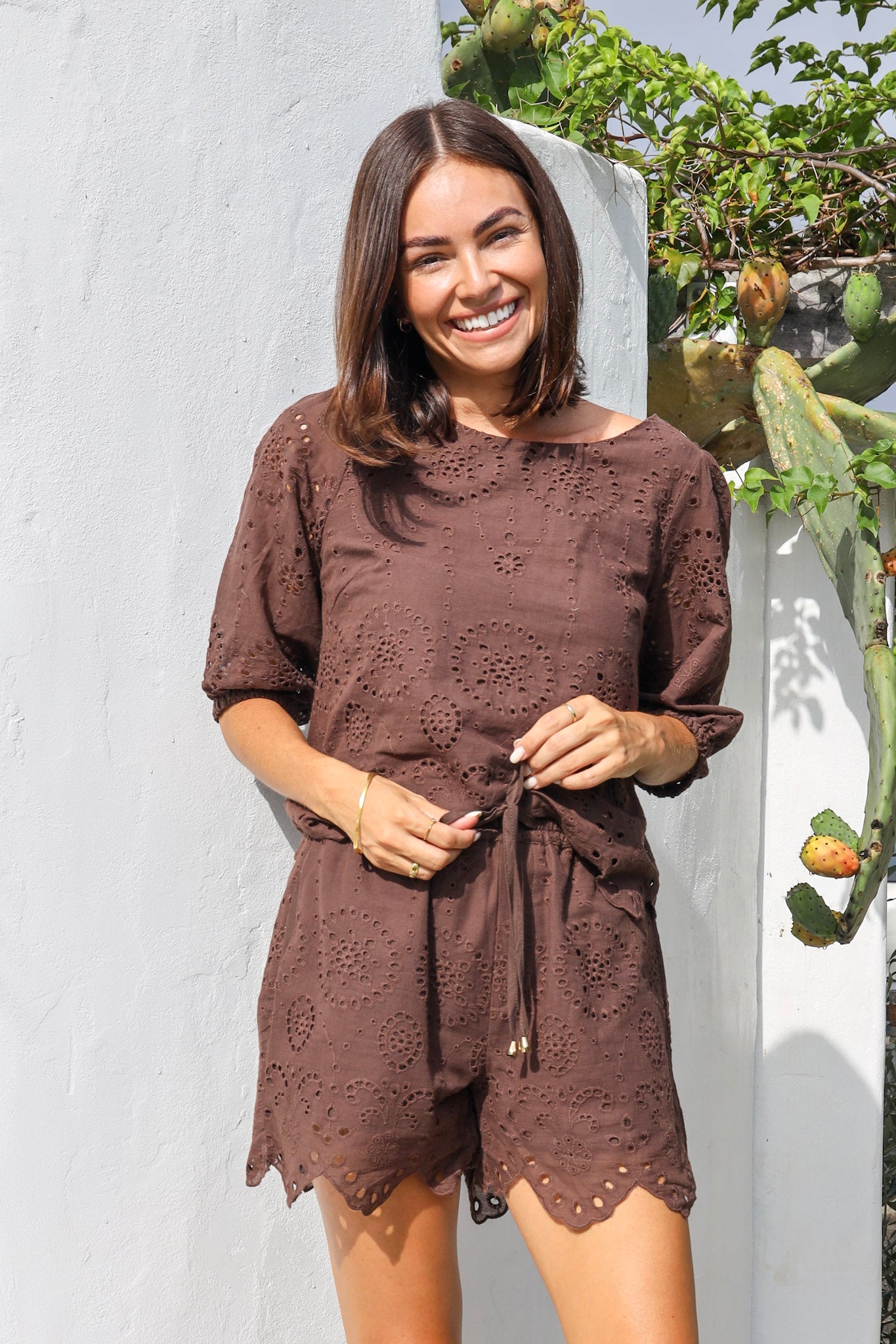 The Portia Short Set is crafted in stunning chocolate broderie anglaise, this matching set brings all the luxe texture with an effortless, breathable feel.